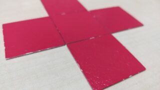 知研ボックスQ-11期【青と赤】は、青と赤のピースを用いた平面パズルで正方形・直角二等辺三角形の合成を行い、図形構成能力...