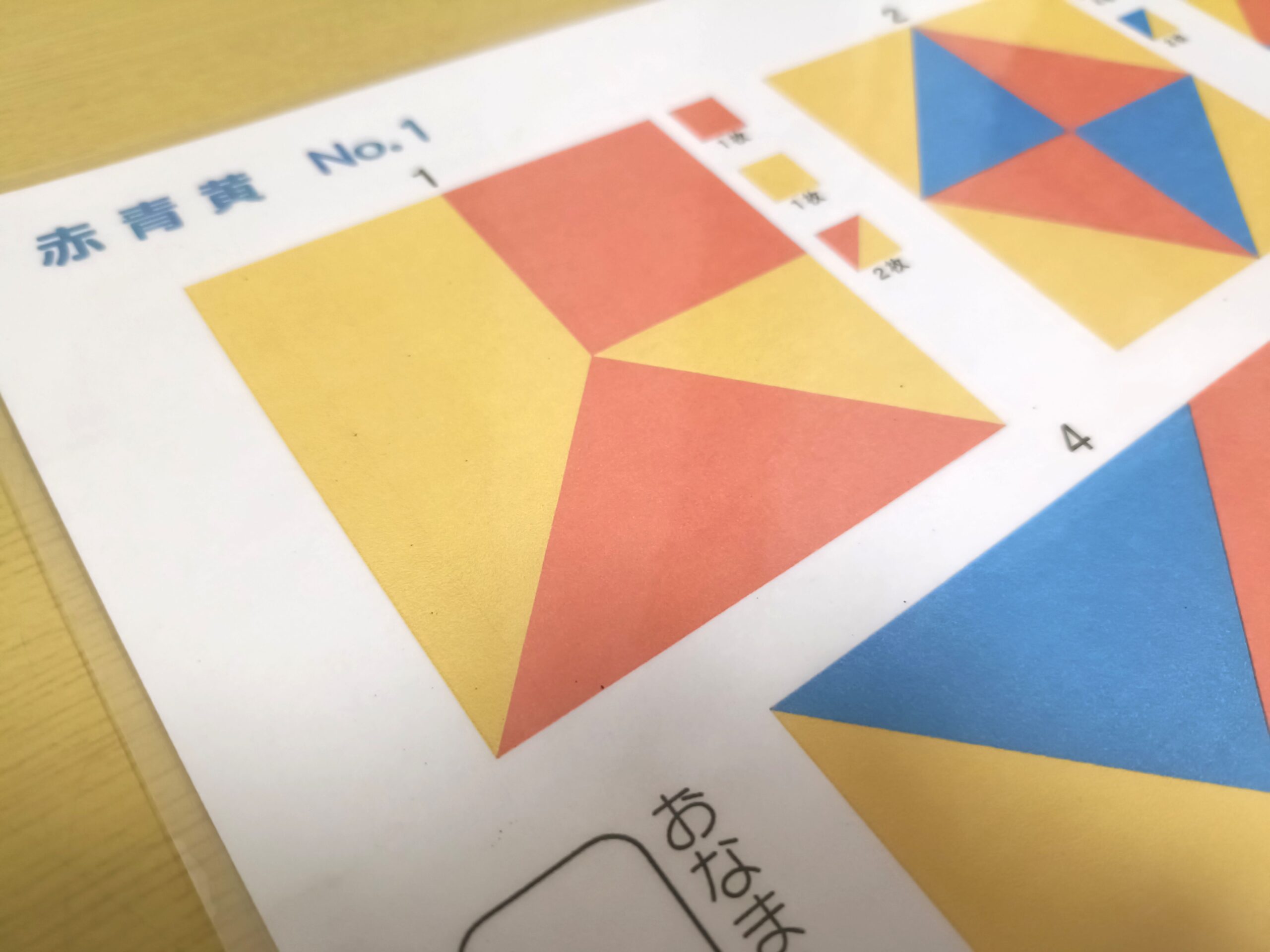 むずかしい場合は①と同様、見えている模様(正方形、三角形など)を手掛かりに最初の1枚が置けるようヒントを与えてあげましょう。