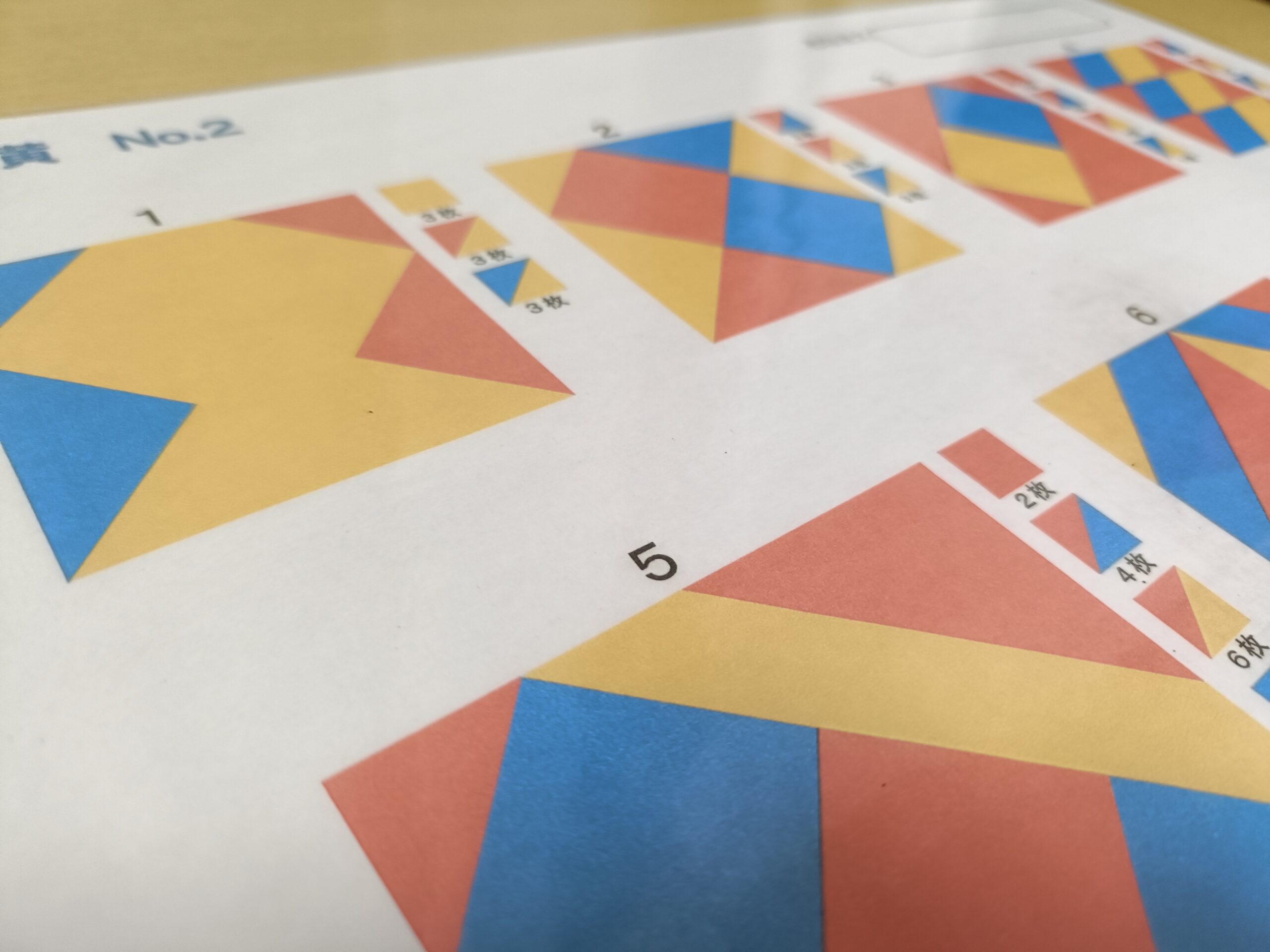 見本を見ながら頭の中で模様を分割し、どのピースが当てはまるかを考えて合成することで、図形構成力をやしないます。