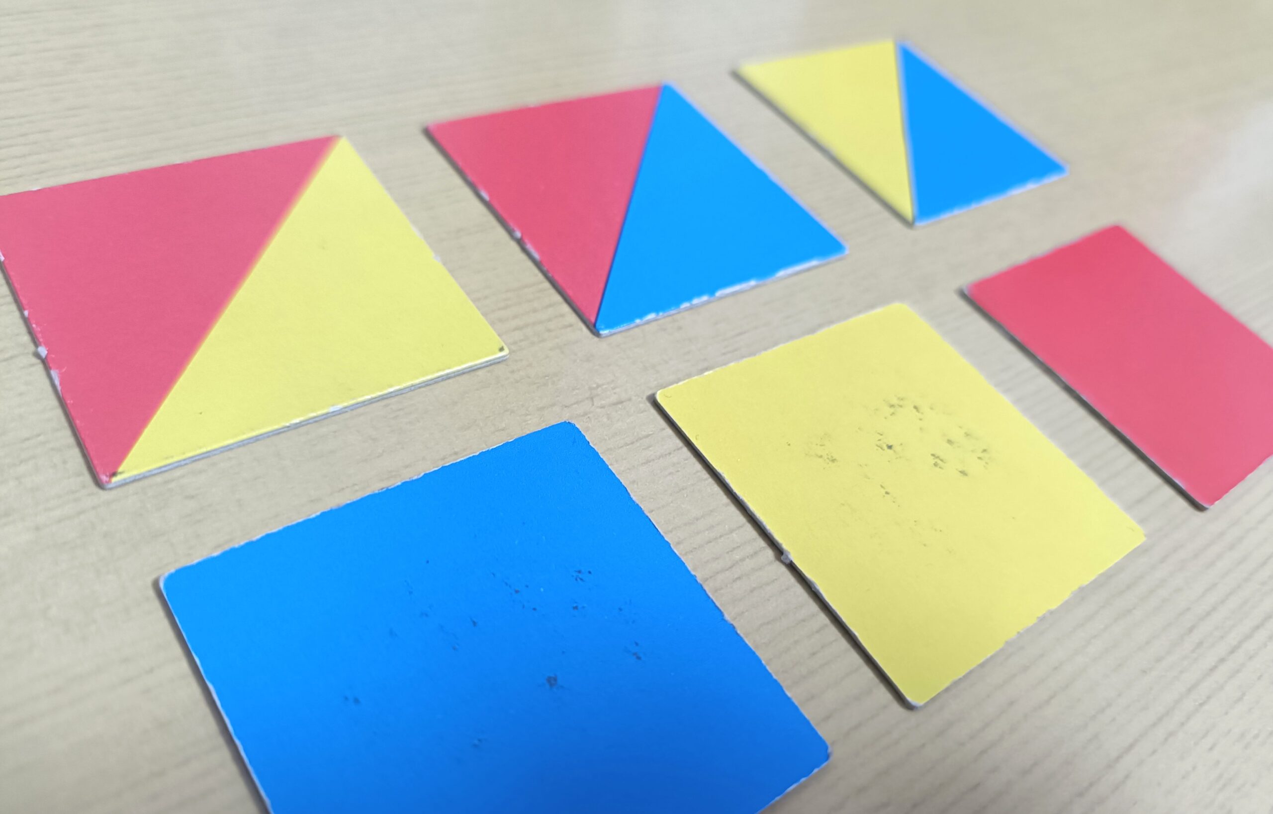 積み木は赤・青・黄・白の4色がそれぞれの面に塗られており、1面が1色(正方形)および2色(直角二等辺三角形)になっています。